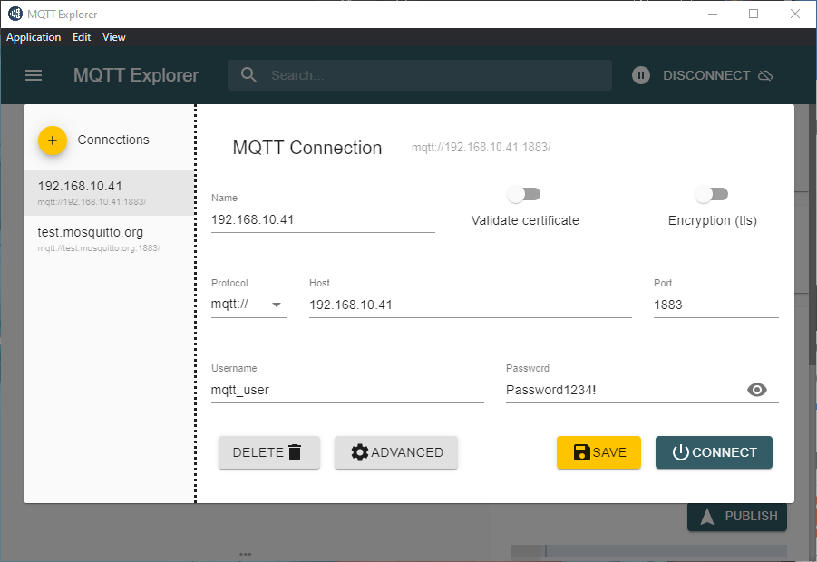 Now lets test we can connect and monitor what is happening inside the Mosquitto broker. For this we’re going to install MQTT Explorer http://mqtt-explorer.com/.