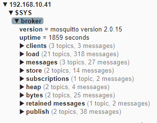 We should see the server IP and then the topics that have had messages published to them, we can expand the $SYS topic to see some basic stats.