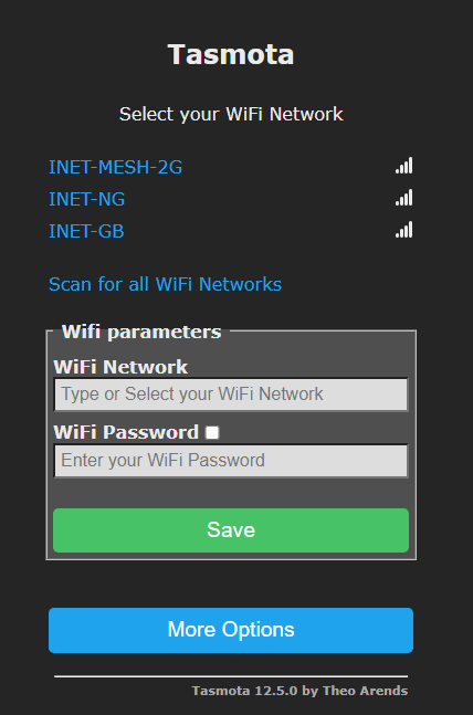 Connect to the WiFi network, the Tasmota ESP will run in Access Point mode, and runs a captive portal, so usually a webpage will open to the ESP on http://192.168.4.1/ if this doesn’t appear just open a browser and connect to it.