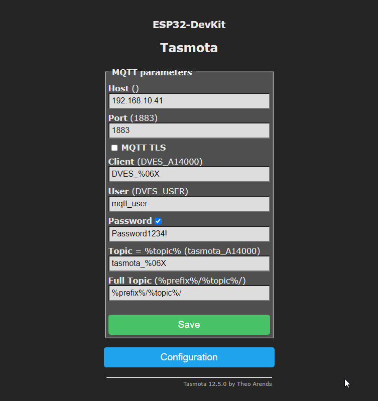 The host is the IP (or DNS) of the Home Assistant server, enter the User and Password configured on the MQTT broker earlier and click on ‘Save’.